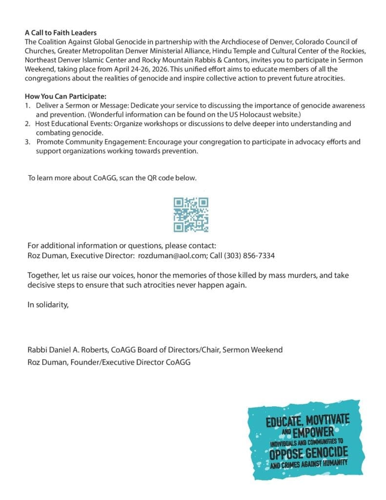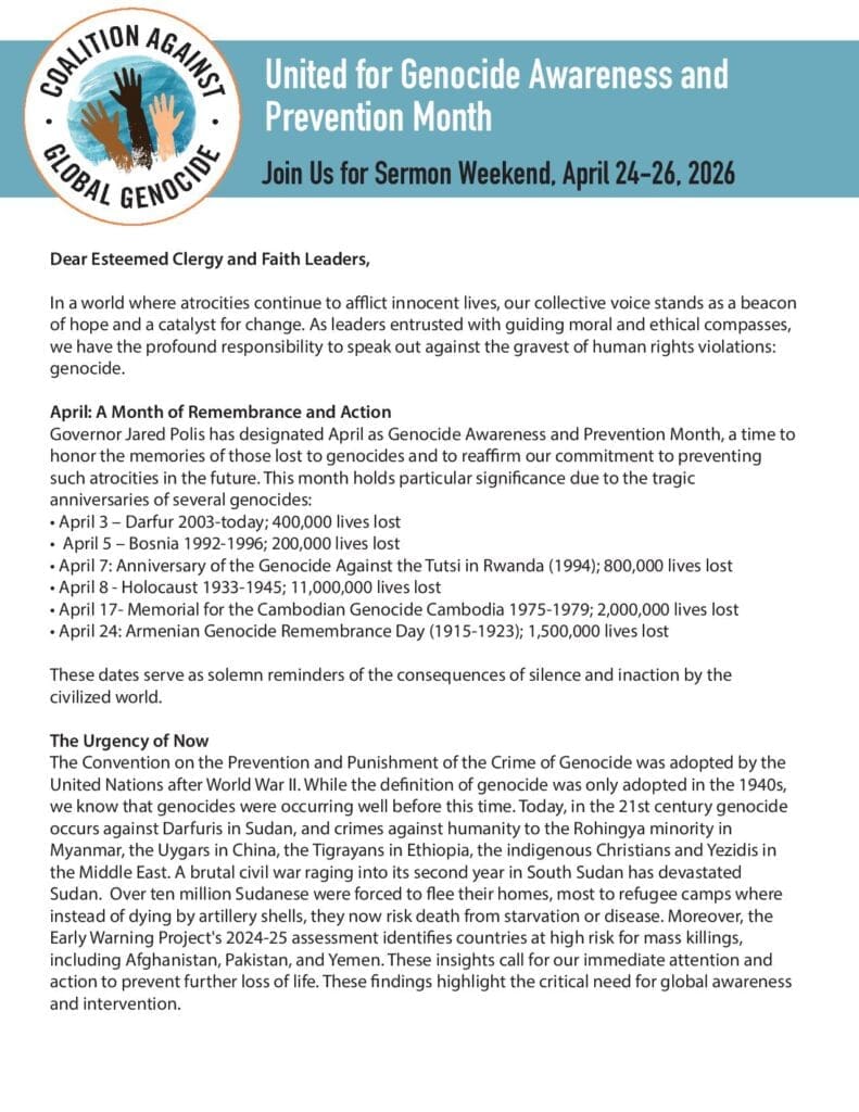 The Coalition Against Global Genocide in partnership with the Archdiocese of Denver, Colorado Council of Churches, Greater Metropolitan Denver Ministerial Alliance, Hindu Temple and Cultural Center of the Rockies, Northeast Denver Islamic Center and Rocky Mountain Rabbis & Cantors, invites you to participate in Sermon Weekend, taking place from April 24-26, 2026. This united effort aims to educate members of all the congregations about the realities of genocide and inspire collective action to prevent future atrocities.
